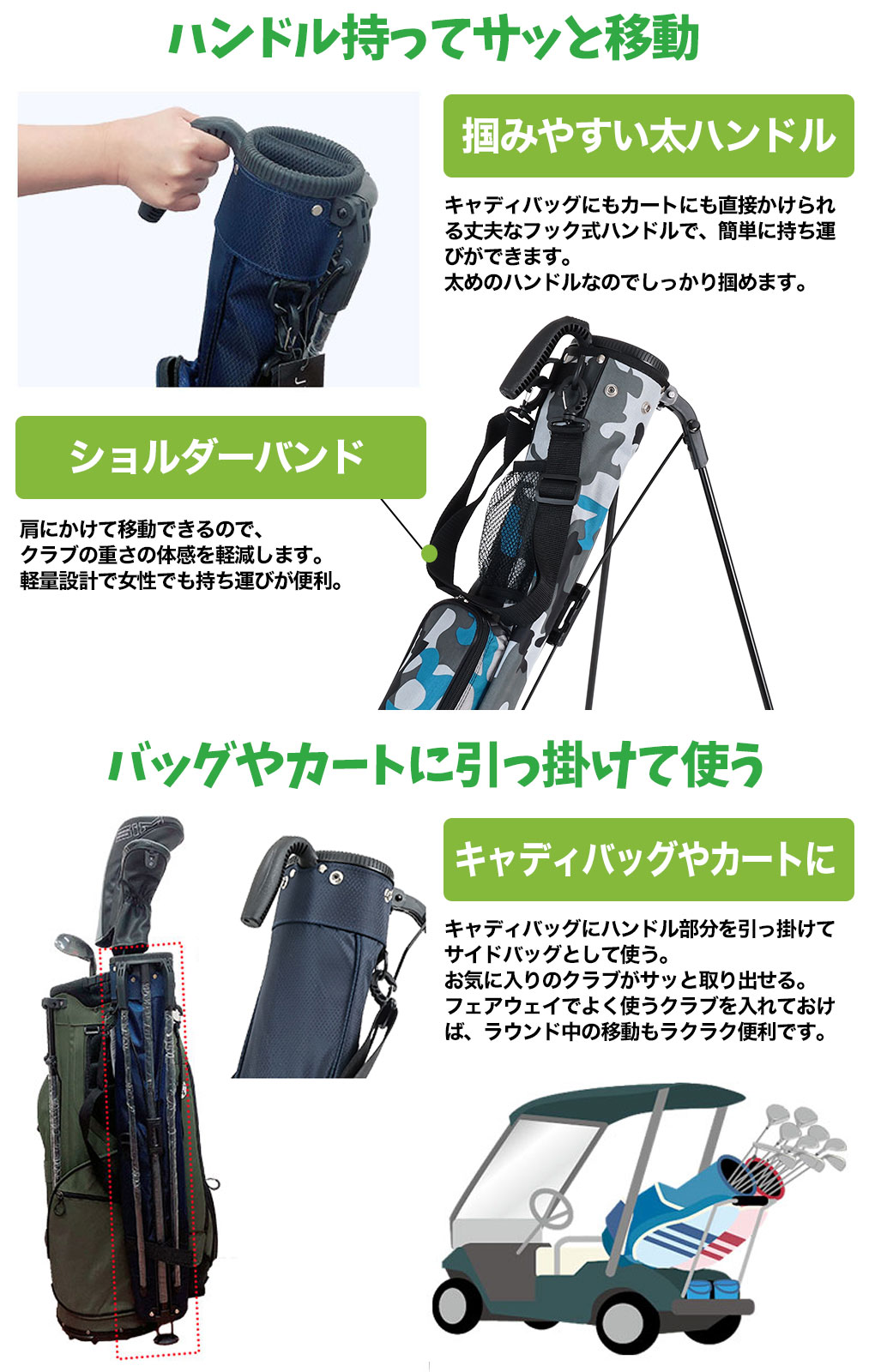 安定して掴みやすい太めのハンドル、クラブがぶつかりにくく取り出しやすい2分割口径、