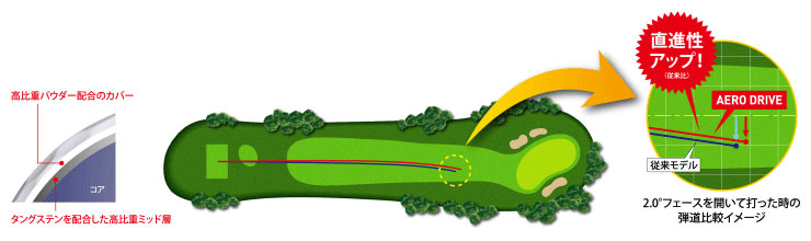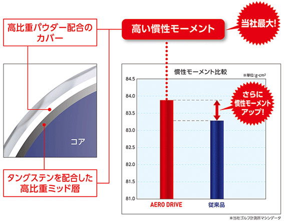 剛性の高い薄カバー「高比重パウダー配合高反発アイオノマー薄カバー」を採用。