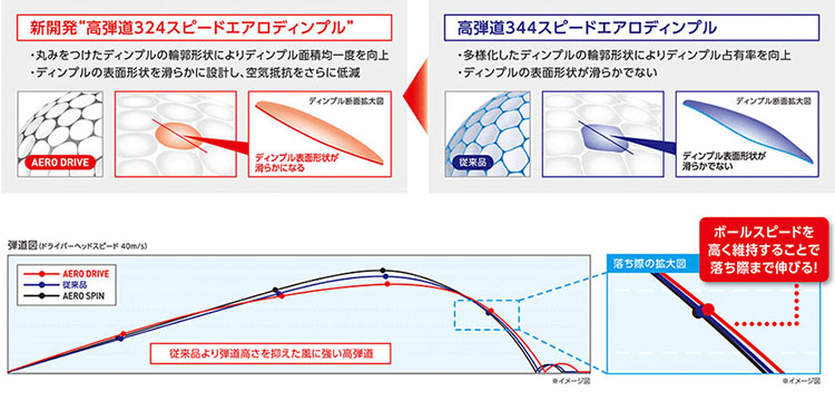 ■「高弾道324スピードエアロディンプル」により、風に強い伸びのある弾道を実現