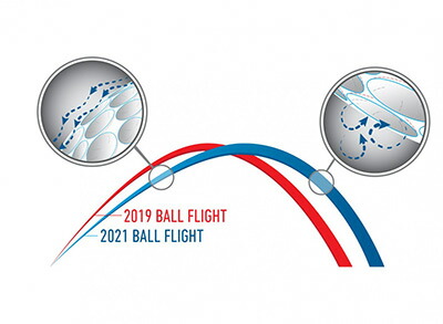 新設計の「ツアーフライトディンプルパターン」が次なるレベルのエアロダイナミクス効果を生み出す。約10年ぶりに一新されたその新設計ディンプル形状により、インパクト直後からドラッグ(空気抵抗)を低減することで最高到達点(弾道で最も高くなる位置)がより遠くへ伸び、さらに最高到達点からの落下時には揚力を増加させることで、キャリー飛距離を伸ばすことに成功。
