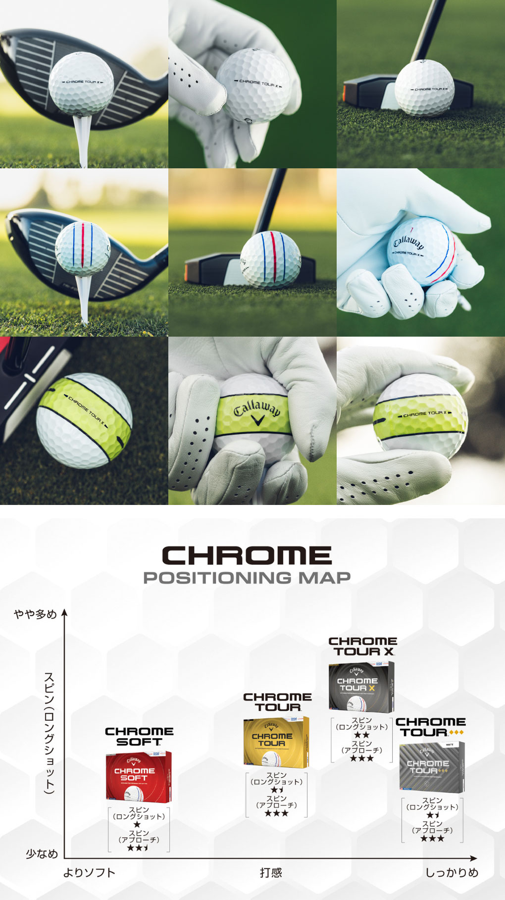 前作のCHROME TOUR Xボールはツアープロにも広く愛用されたボールでしたが、ロングショットのスピン量が少し多めである、という声も上がっていました。今回の新しい「CHROME TOUR Xボール」では、その要望に応えるべくマントル(コアから2層目)に新素材を採用し、カバーをさらに薄くすることで、ドライバーショットを含むロングショットのスピン量を抑えることに成功。なお、アイアンショットやグリーンサイドでのスピン量は、従来同様に高いレベルで維持したままとなっています。