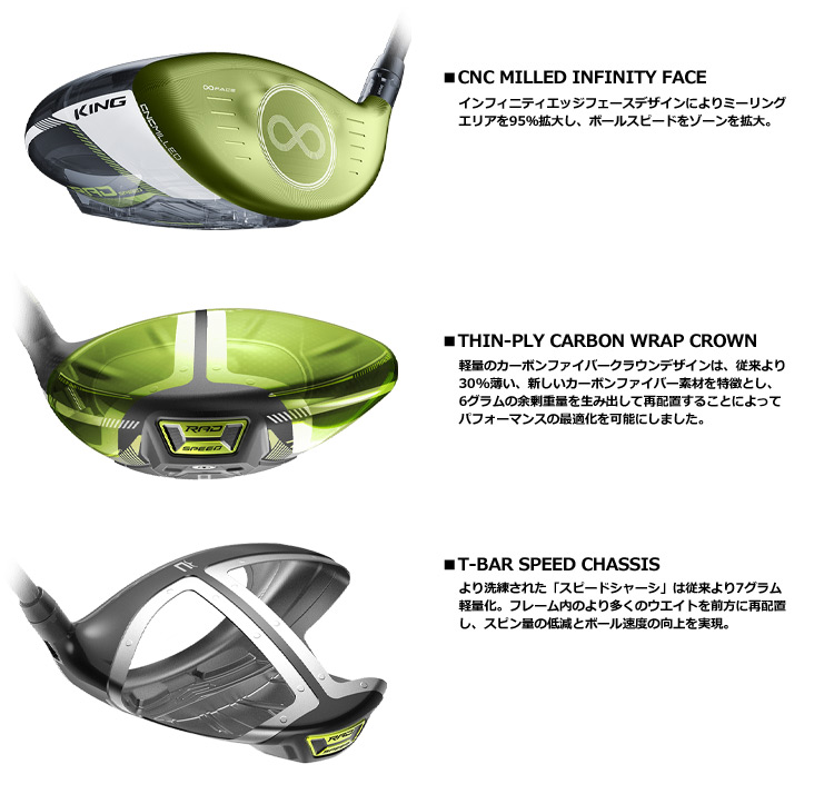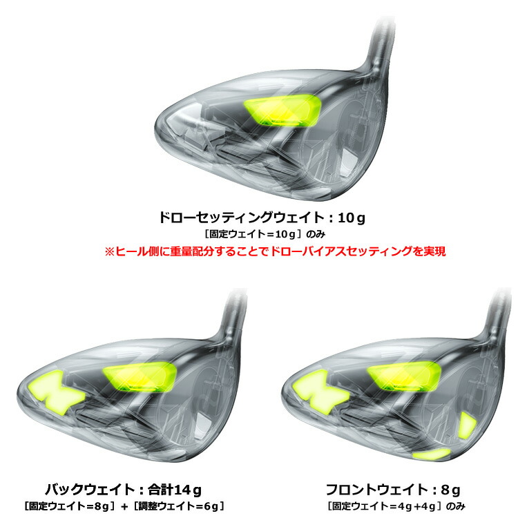 最大の特徴であるヒール側に設置されたドローバイアスウェイトによりスライスを低減。また、バックウェイトによる高弾道と直進性、フロントウェイトによる低スピンと高速なボールスピードで飛距離性能や許容性も高レベル。