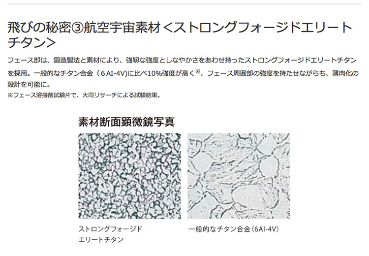素材 フェース部/α-β系チタン合金(SP700)鍛造、本体/α-β系チタン合金(Ti-8Al-1Mo-1V)精密鋳造