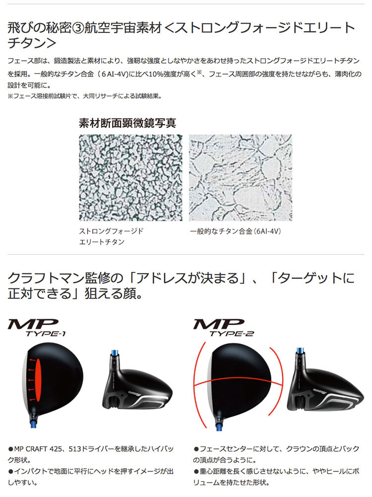 素材 フェース部/α-β系チタン合金(SP700)鍛造、本体/α-β系チタン合金(Ti-8Al-1Mo-1V)精密鋳造