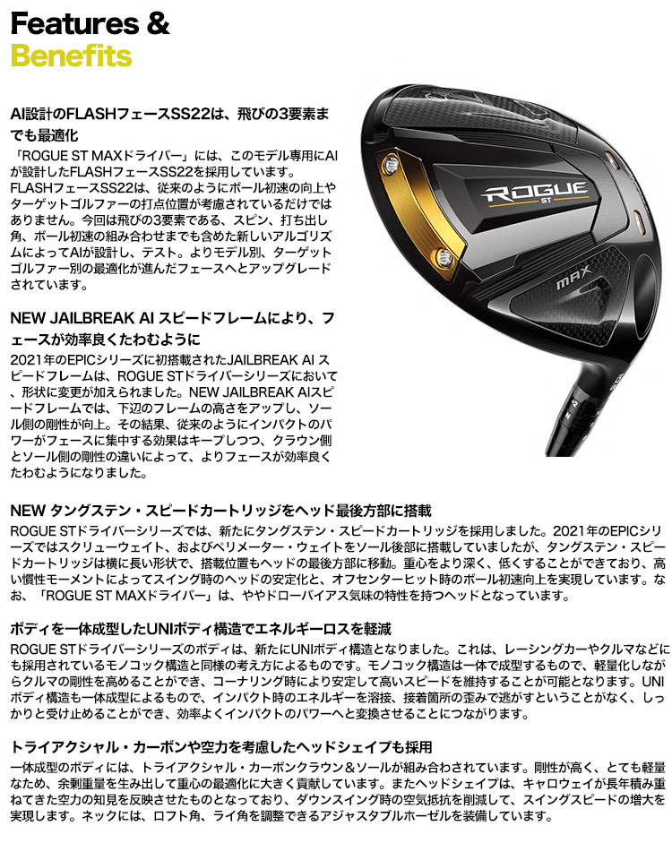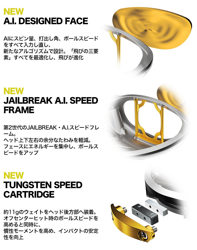 キャロウェイ独自のAI設計によるFLASHフェースSS22やJAILBREAK AI スピードフレームは、より効率化と最適化が図られ、トライアクシャル・カーボンクラウン&ソールを搭載するボディには、新たに一体成型のUNIボディ構造を採用。