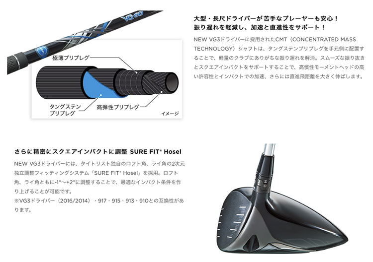 ※VG3ドライバー(2018/2016/2014)は、917・915・913・910ドライバー用SURE FIT Hosel付きシャフトと互換性があります。