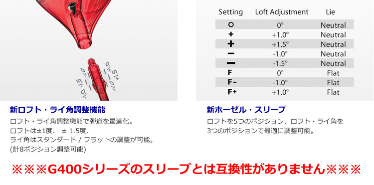 ・専用トルクレンチ…ロフト・ライ角調整機能で弾道を最適化。ロフトは±1度、 ± 1.5度、ライ角はスタンダード / フラットの調整が可能。