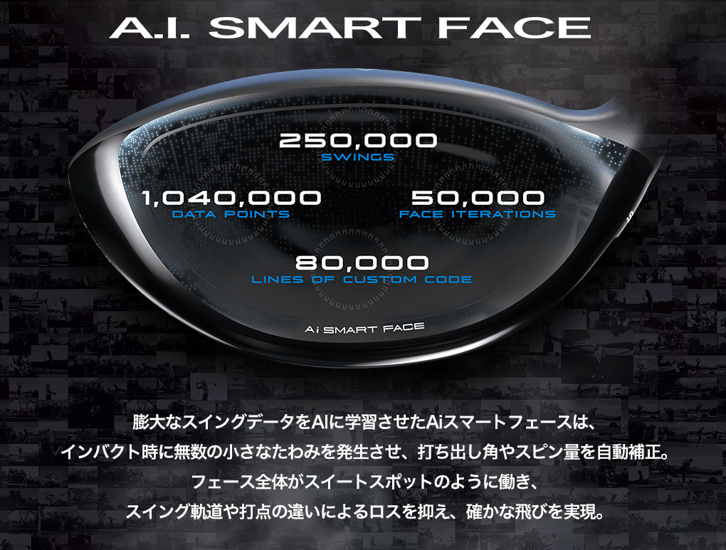 飛距離アップ、スピンの低減、弾道のバラつきの抑制といった条件のもと、AIはこのリアルなデータを生かしながら、スーパーコンピューター上で5万回もの設計とテストを実施。完成したフェースは、Aiスマートフェースと名づけられました。Aiスマートフェースは、まさに常識を覆す飛びとやさしさを実現しています。どのような打ち方、ヘッドの入り方をしても、フェースのあらゆる部分でマイクロディフレクション(無数のたわみ)を起こすことで、ベストなボールスピード、スピン、方向、打ち出し角となるように補正。ボールはいままで以上に強く、遠くへ飛んでいき、とても狭い範囲に着弾するようになっています。また、このAiスマートフェースの能力によって、フェースのギア効果や高慣性モーメントの効用などは、それほど考慮しなくてよいものに変わりました。