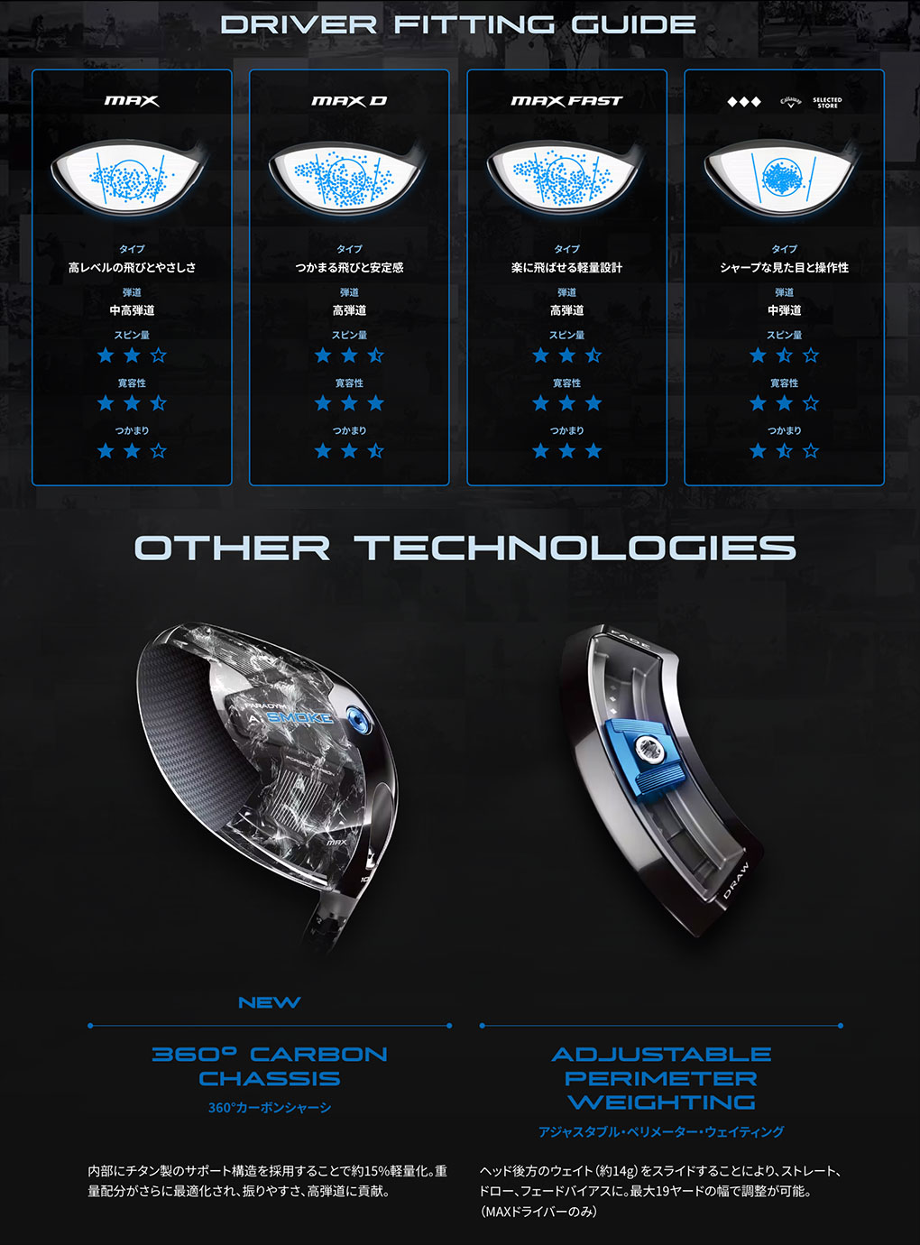 このAiスマートフェースを搭載した新しいドライバーは、前作よりも軽量化された360°カーボンシャーシを搭載して、4種類のモデルをラインアップ。もっともスタンダードな「PARADYM Ai SMOKE MAXドライバー」は、フェースのやや広い範囲で、より効果的に作動するよう、Aiスマートフェースが設計されており、4種類のなかでも、もっとも幅広いレベルのゴルファーに対応するモデルです。