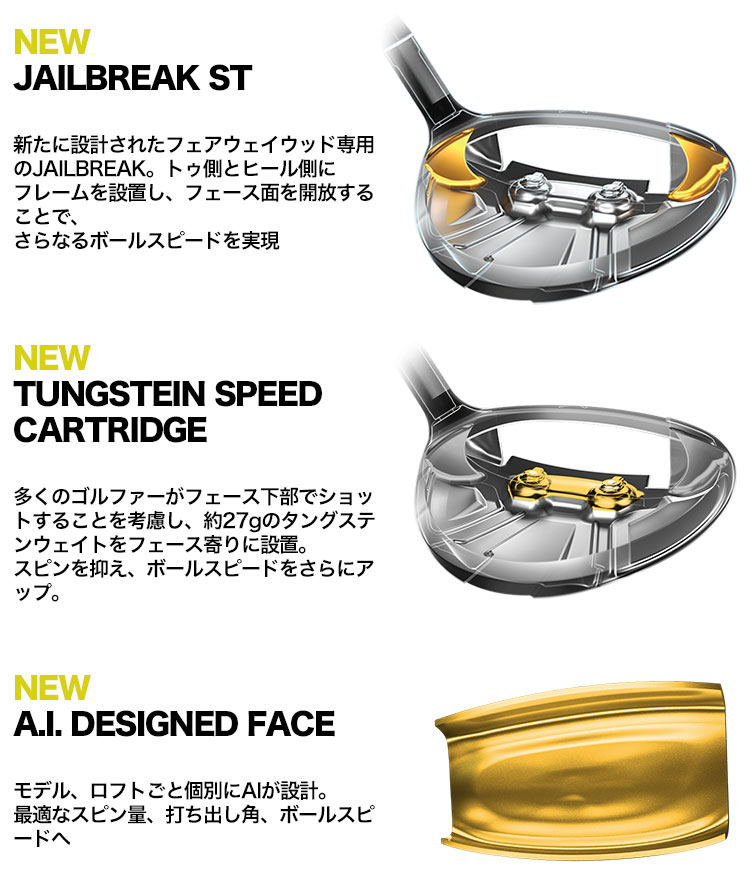 ROGUE STフェアウェイウッドシリーズにおける最大のトピックが、AI JAILBREAK STの搭載です。従来のJAILBREAK AIベロシティブレードで見られたブレード形状から、三日月のような形状に進化。搭載位置も、2つがより離されて、フェース面近くのトウ・ヒール部へと変更になりました。これにより、フェースにエネルギーを集中させる効果は維持しつつ、フェースカップの端までしっかりとたわませることが可能となり、ボール初速が最大化。また、2つのAI JAILBREAK STによって、トウ・ヒールの慣性モーメントも高まっており、ヘッドの動きの安定性やミスヒットへの強さも向上しています。