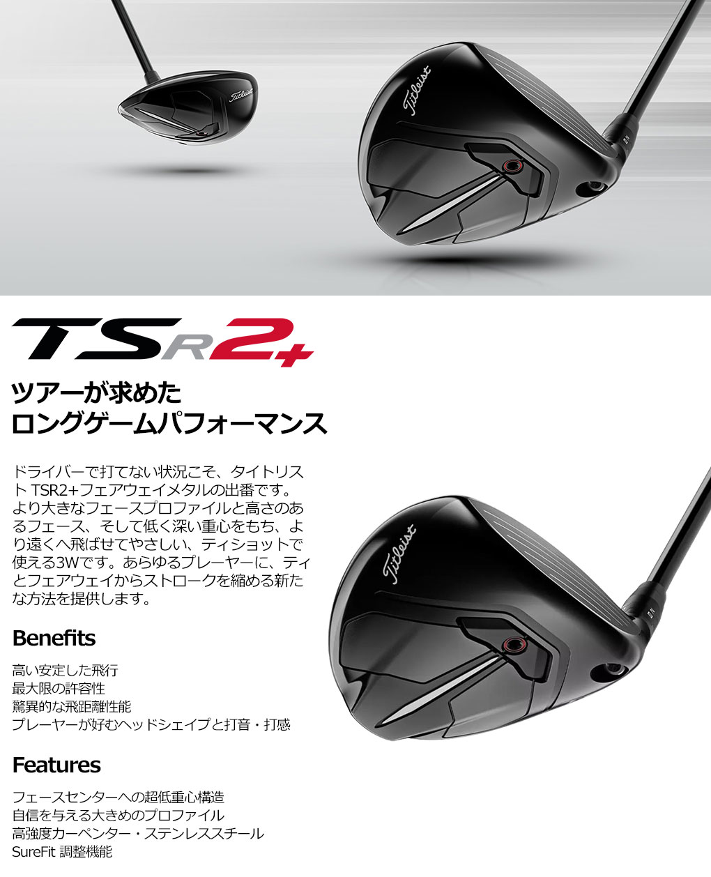 ドライバーで打てない状況こそ、タイトリスト TSR2+フェアウェイメタルの出番です。より大きなフェースプロファイルと高さのあるフェース、そして低く深い重心をもち、より遠くへ飛ばせてやさしい、ティショットで使える3Wです。あらゆるプレーヤーに、ティとフェアウェイからストロークを縮める新たな方法を提供します。