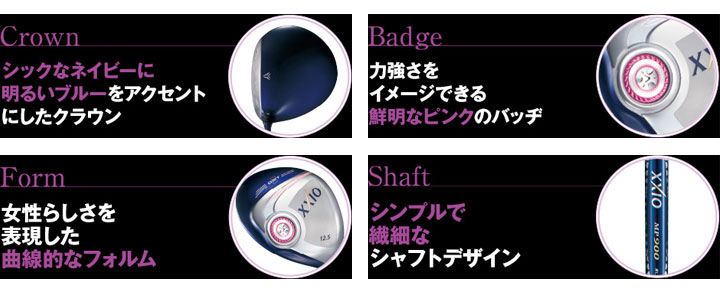 デザイン面では、柔らかい丸みを帯びたヘッド形状やソールデザイン、明るめのブルーをアクセントにしたクラウンカラー、ドット柄のシャフト、そしてバッジにはアクセントとなるピンクを採用しています。
