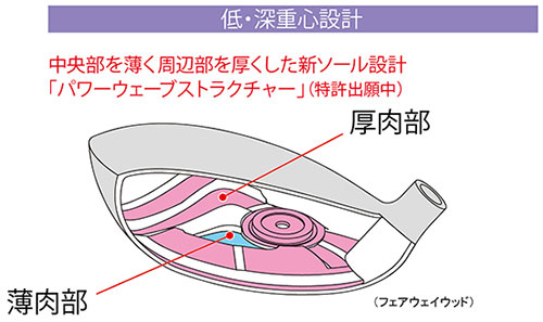 新開発カップフェースと新ソール設計「パワーウェーブストラクチャー」の低・深重心設計により、フェース下部の反発性能が上がり、飛びが安定します。