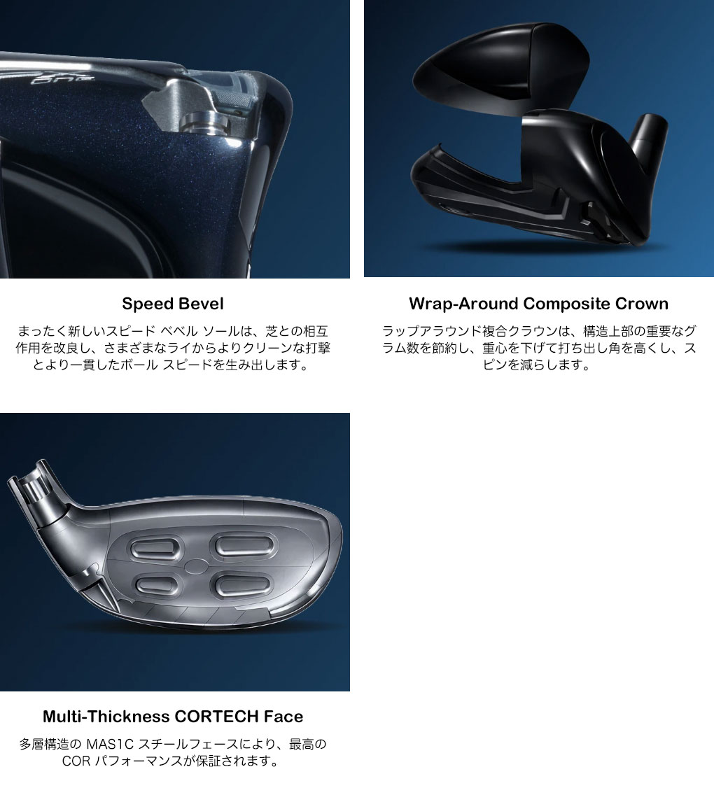 JPX ONEフェアウェイは、ソールとチャンバーウォール間の内部ギャップを戦略的に変化させる、再設計されたCORTECHチャンバーを採用しています。この形状により、トゥとヒール方向へのフェースのたわみが増大し、センターパフォーマンスを損なうことなく、打面全体へのエネルギー伝達を増幅します。各ヘッドは、構造上部の重要な重量を削減するラップアラウンド複合クラウンを採用し、低重心化を実現することで、高い打ち出し角と低スピン化を実現しています。多層構造のMAS1Cスチールフェースは最高のCORパフォーマンスを確保し、全く新しいスピードベベルソールは芝との接触を改善し、様々なライからよりクリーンな打球感と安定したボールスピードを生み出します。