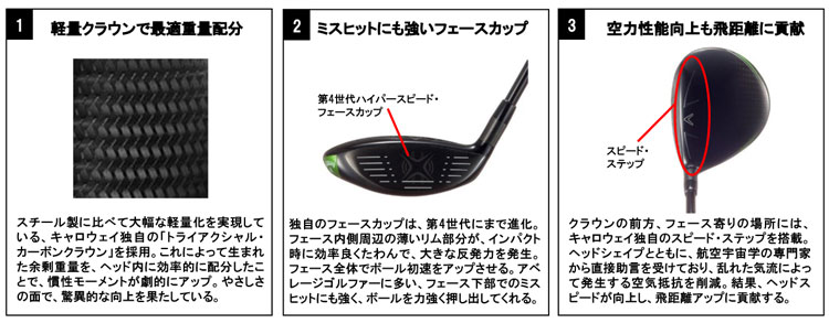 →スピード・ステップのサイズ、流線型のヘッドに、航空宇宙学の専門家から直接助言を受け開発したキャロウェイ独自のスピード・ステップを搭載。