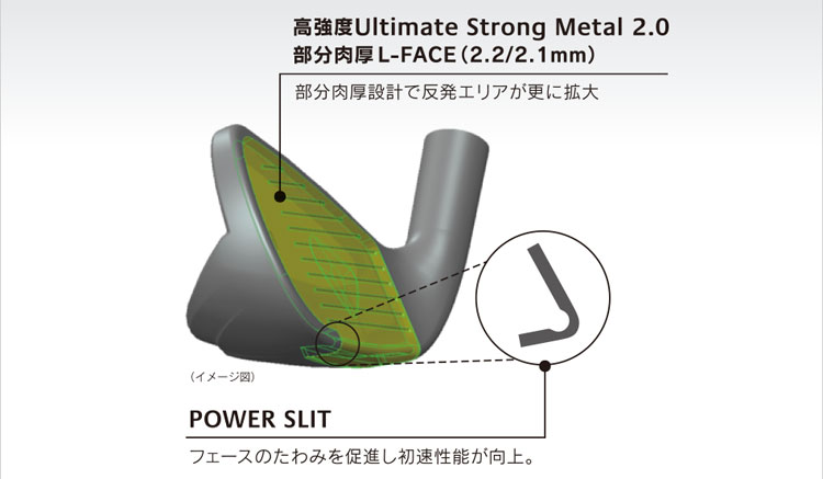 さらにパワースリットと部分肉厚設計の効果で、アイアンの打点に合わせて反発エリアを拡大し、初速アップを追求しています。