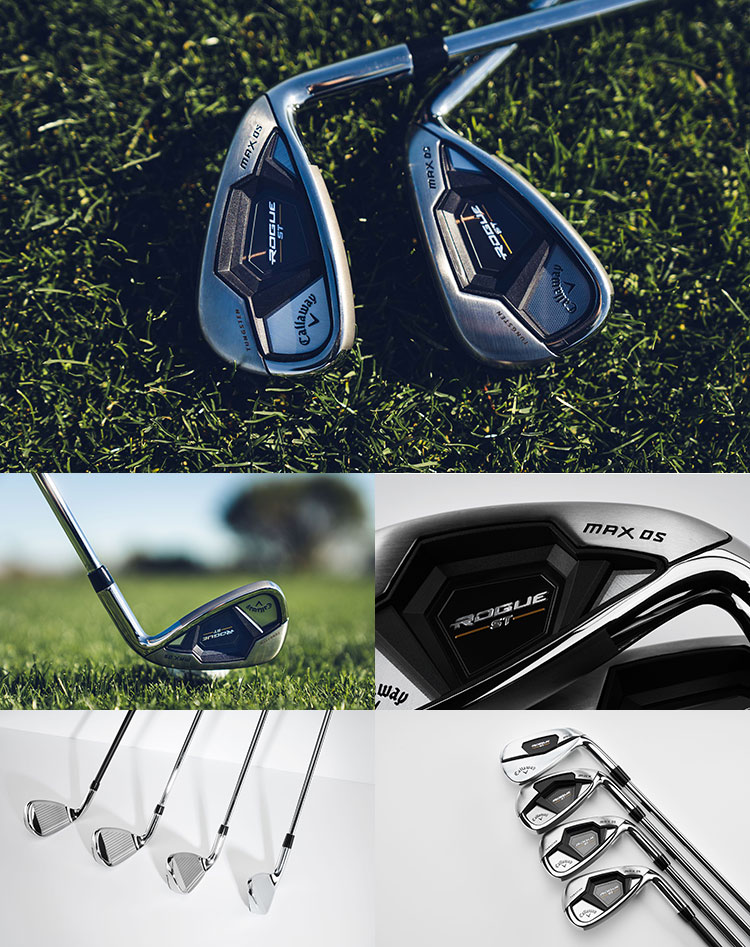「ROGUE ST MAX OSアイアン」はフルキャビティバック形状で、シリーズ中もっともワイドなソール、トップブレードを持ち、オフセットも大きくされています。キャロウェイがつくりつづけてきた、やさしいアイアンのスタイルを踏襲しているモデルと言えます。そこにセミストロングロフトの設定も加わることにより、「ROGUE ST MAX OSアイアン」はシリーズでもいちばんの高弾道を、非常にやさしく、しっかりとつかまったボールで実現します。番手はI#5からSWまでの9本をラインアップし、そのうちウェッジはPW、AW、GW、SWの4本となっています。