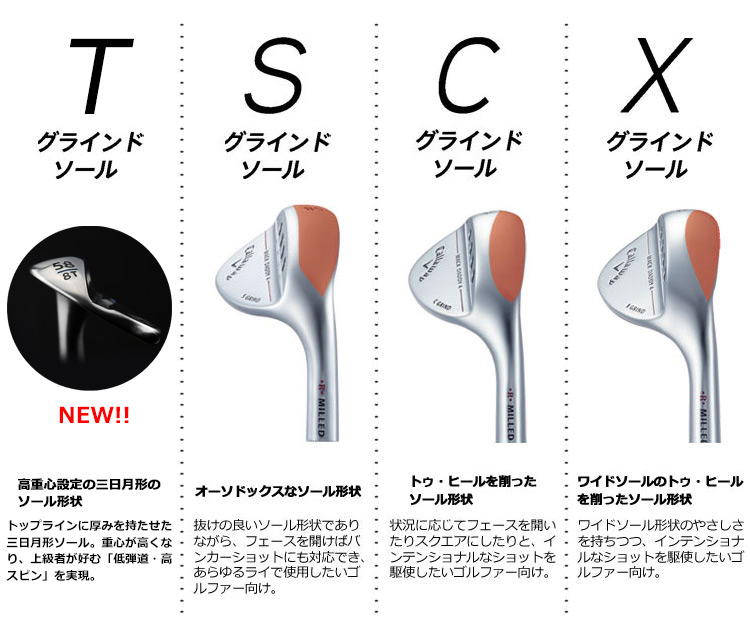 あらゆるゴルファー、シーンに対応すべく、T、S、C、Xの4つのソール形状をラインアップ。