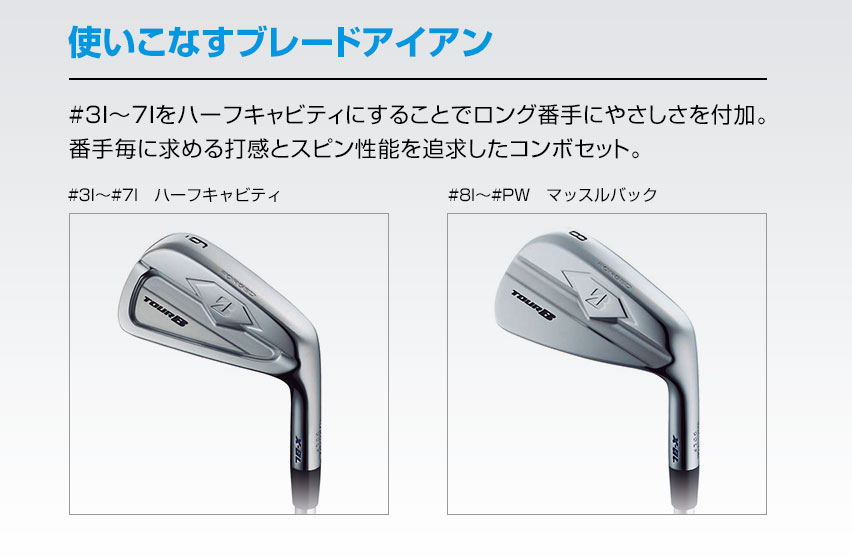 ロング番手(#3-#7)をハーフキャビティに、ショート番手(#8-PW)をマッスルバック西、番手ごとに求められる打感とスピン性能を追求したコンボセット。