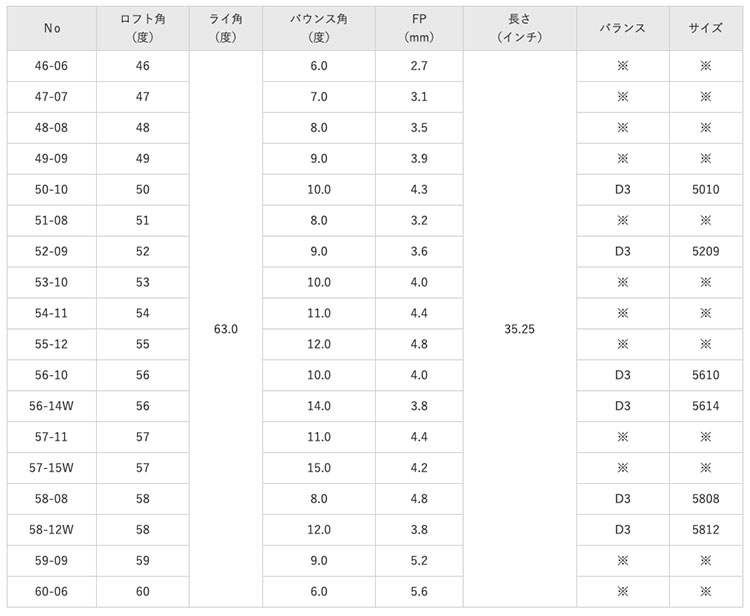 ロフト角(度) No.50-10/50、No.52-09/52、No.56-10/56、No.56-14W/56、No.58-08/58、No.58-12W/58