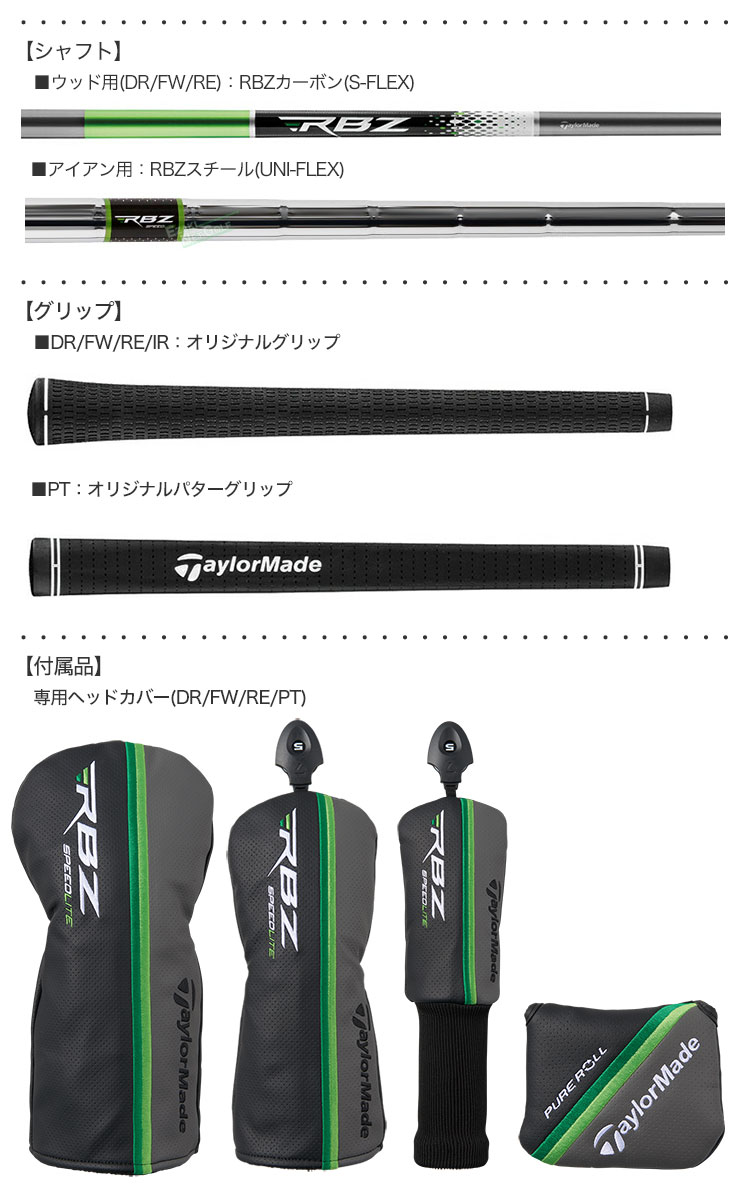 シャフトモデル/フレックス ●DR / FW / RES:RBZカーボン(S-FLEX) ●IR:RBZスチール(UNI-FLEX) ●PT:スチール