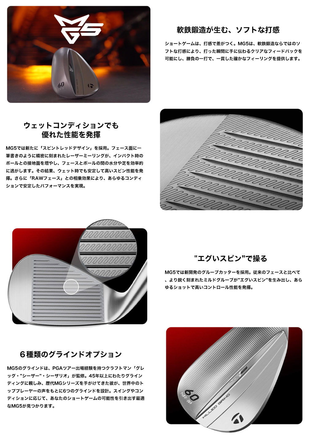 ツアーからのフィードバックを元に誕生した全く新しい「MG5」ウェッジ。軟鉄鍛造がもたらすこれまでに無いソフトな打感と優れた操作性が、あなたの感覚を研ぎ澄ます。さらに新開発のグルーブカッターを採用し、従来よりも鋭く刻まれたミルドグルーブが”エグいスピン”を生み出す。ショートゲームの可能性を次なるレベルへ。