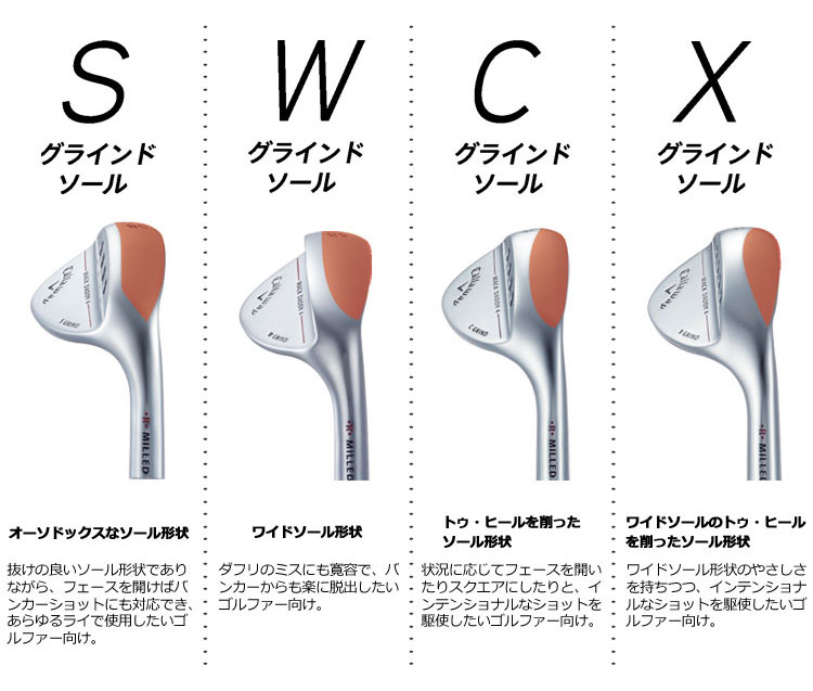 あらゆるゴルファー、シーンに対応すべく、S、W、C、Xの4つのソール形状をラインアップ。