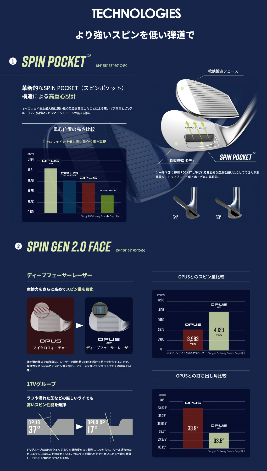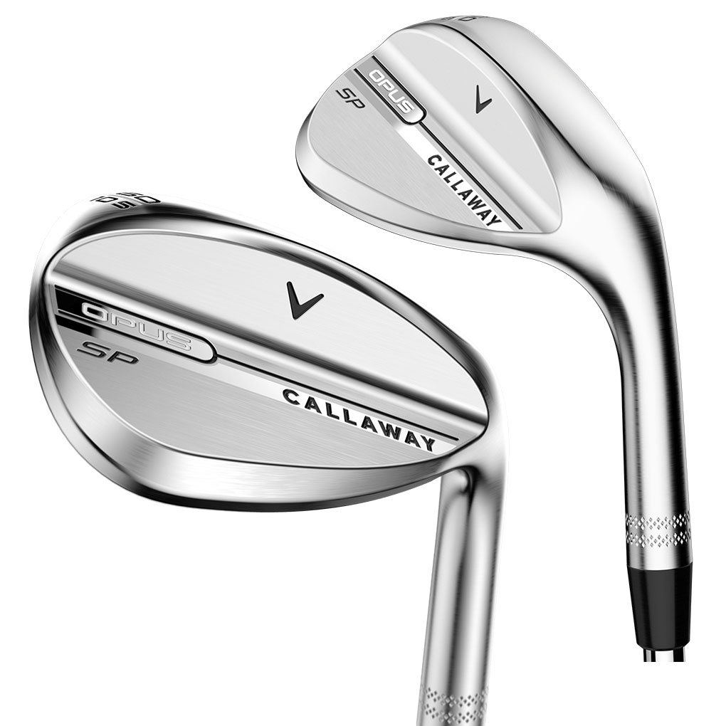 OPUSウェッジの登場からわずか1年足らずで、さらに進化を遂げたウェッジがラインアップに加わります。開発者が追求し続けてきた重要指標 Spin Per degree(スピン/打ち出し角)の2つの頭文字を名前に取り入れた、「OPUS SPウェッジ」です。フェースには新開発の17Vグルーブを狭いピッチで配置し、ソール内部にはキャロウェイ独自の革新的な内部構造であるSPIN POCKET(スピンポケット)を搭載。このSPIN POCKETによって重心設計が最適化され、強烈なスピンと狙い通りの低弾道を実現します。さらに、従来のマイクロフィーチャーに代わって、網目状の粗さを生み出すディープフェーサーレーザーを初採用。スピン性能と止まる力を、これまで以上に高めました。ツアープロにも高評価を得たShape 6(シェイプ6)のヘッド形状を継承し、 仕上げはクロムとブラックの2タイプ。ソールグラインドは、T、C、X、S、Wの5種類をラインアップ。すべてのプレーヤーに対応できる完成度を誇ります。