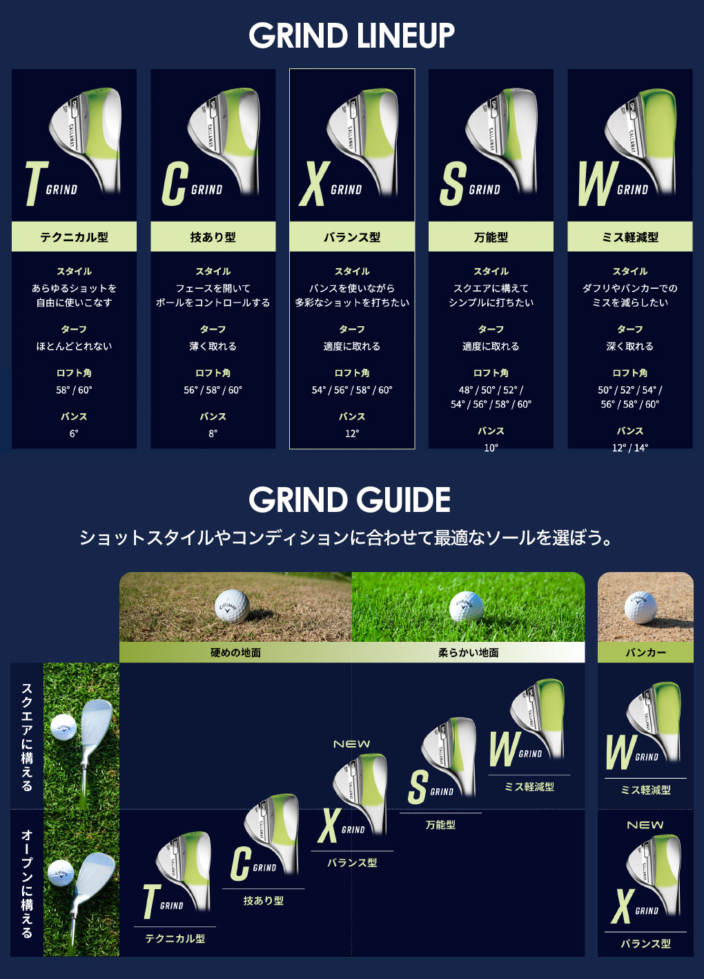 バックフェースに入れられたCALLAWAYの8文字は、ユーザーに新鮮さを感じさせるものかもしれません。シェブロンマークと組み合わせて曲線的に文字を配置した従来のロゴに代わり、直線的にレイアウトされたブロックロゴを採用し、シェブロンマークはバンス部分に独立して入れられています。ヘッド仕上げには、クロムとブラックの2種類を用意。ロフトは48度から60度まで、2度刻みで計7種類です。ソール形状では、Xグラインドが復活し、T、C、X、S、Wグラインドと合わせて計5種類が導入されています。