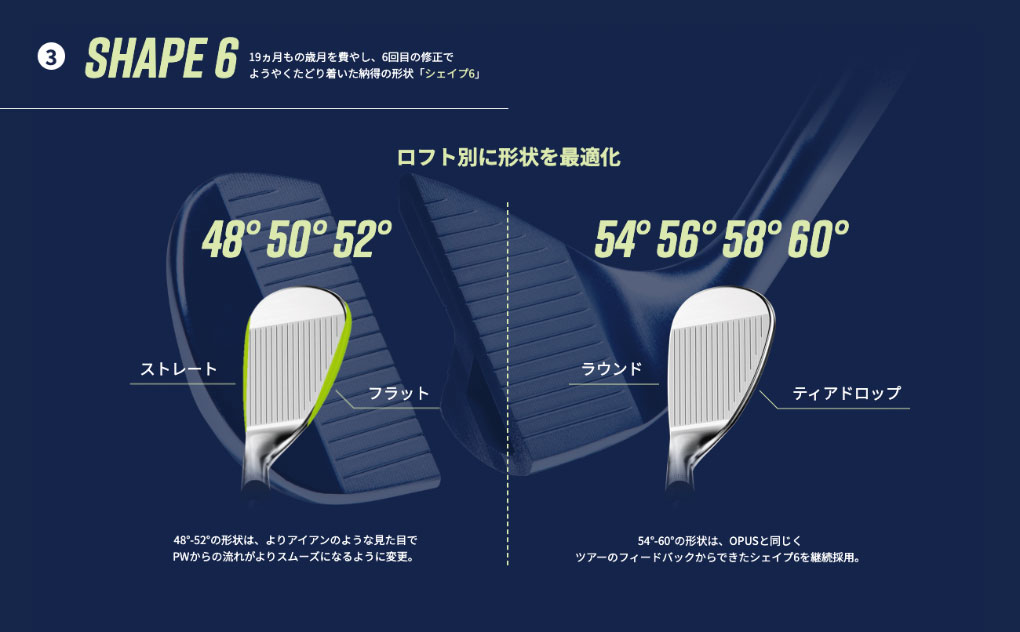 「OPUS SPウェッジ」のヘッドには、OPUSウェッジで導入されたシェイプ6と呼ばれる形状が継承されました。約19カ月をかけて、プロトタイプの製作とツアープレーヤーからのフィードバックの反映を何度も繰り返し、最終的に採用した形状です。6は、6番目に試作された形状であることを意味しています。シェイプ6の大きな特徴の1つはリーディングエッジで、JAWS RAWウェッジとJAWS FORGEDウェッジの中間的な丸みがあるものになっています。JAWS RAWウェッジなどのストレート寄りのものは、フェースを開いたときなどにまったく違う方向を向いているように見える一方、JAWS FORGEDウェッジの形状では丸みが強すぎるという意見もあり、それらを勘案してつくられた形状です。ヘッド全体としては、トップブレードのヒール側が低すぎず高すぎないティアドロップ型で、ホーゼルからフェース面に繋がる部分の造形は、従来の窪みがあるように見えるものではなく、非常に滑らかな曲面になっています。また48~52°ではPWからの流れが途切れないような見た目の工夫が施されております。リーディングエッジやトップブレードがややストレート気味になり、アイアンのような見た目に変わっている点も注目すべき点です。