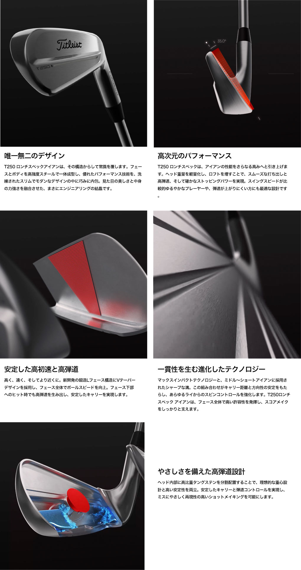 軽量、パワフル、そしてピュア。T250 ロンチスペックは、卓越した初速性能、高弾道、安定性、一貫性をすべて兼ね備えたプレーヤーズディスタンスアイアンです。洗練されたデザインはそのままに、より軽量なヘッドと高めのロフト設計により、パフォーマンスをさらなる高みへと導きます。