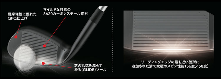 滑るソール(GLIDE)にシャープな溝を継承し、新たな機能を追加搭載。マイルドな打感を生み出す8620カーボンスチールにより、これまでにない極上の打感でピンをデッドに攻めることができます。