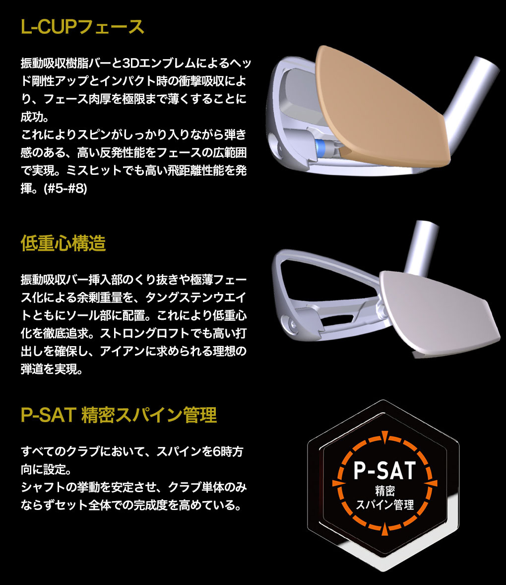 ヘッド素材/製法 17-4+ボディ(鋳造)+【#5~8】AM355Pフェース(鋳造)・【#9~SW】CH170 フェース(圧延) +【#5~8】ステンレスネジ+タングステン+樹脂