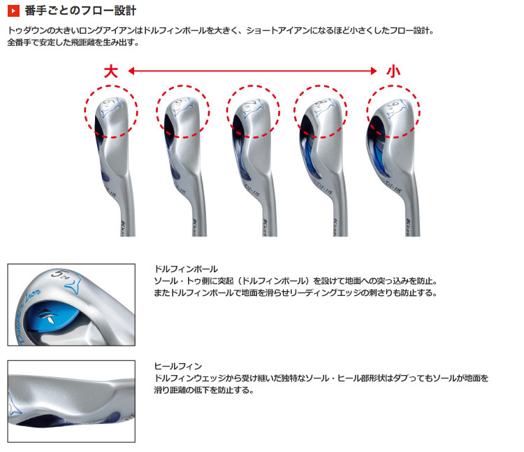 ドルフィンウェッジの抜けの良さを継承。番手ごとにソール形状をフロー設計し、安定した飛距離を生み出す。