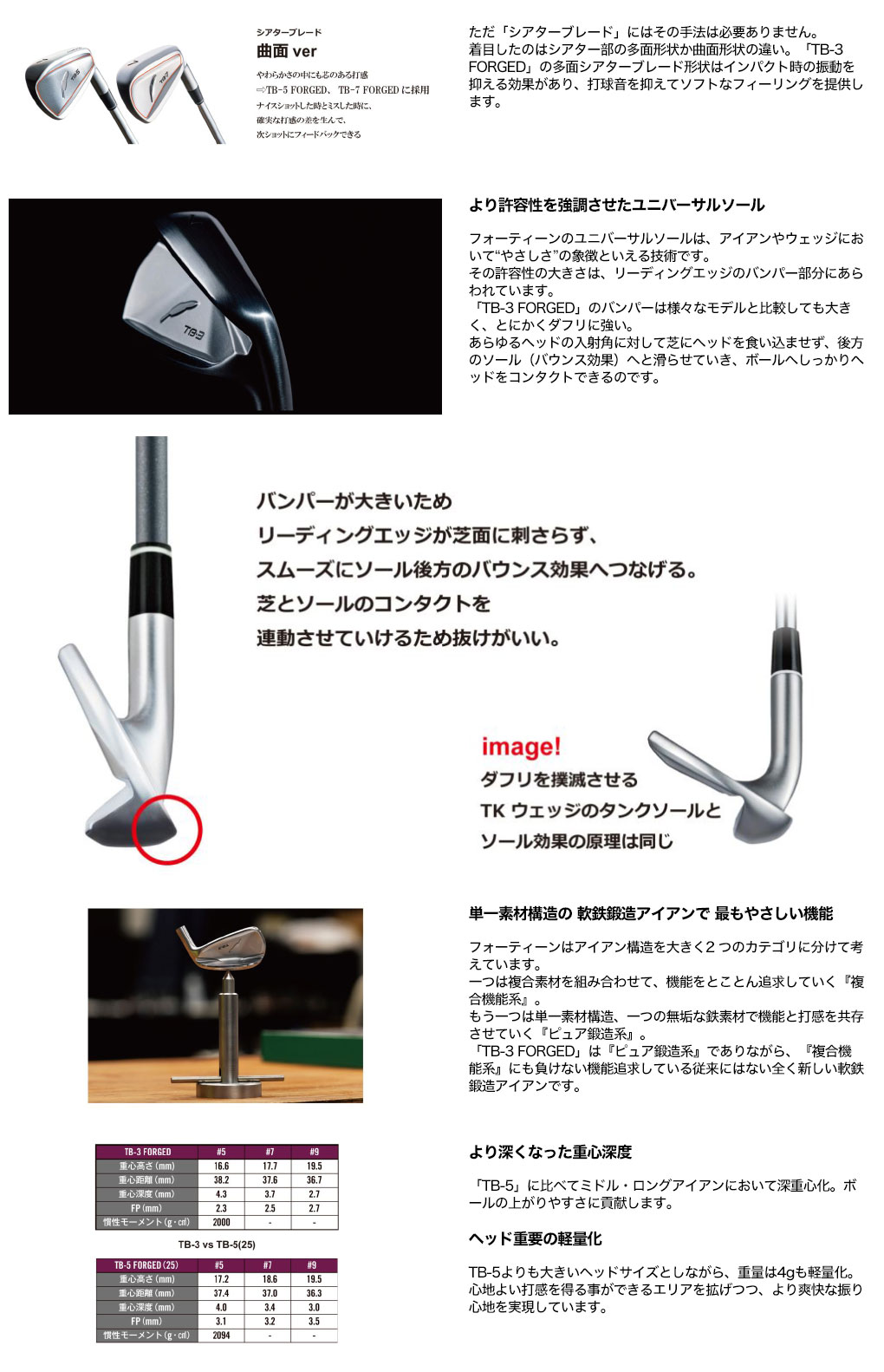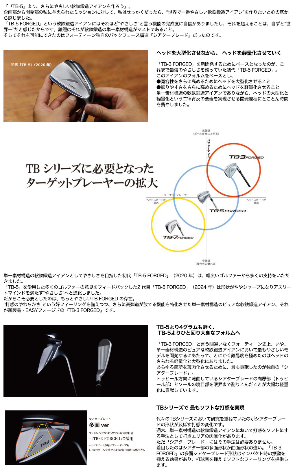 単一素材構造の軟鉄鍛造アイアンとしてやさしさを目指した初代「TB-5 FORGED」(2020 年)は、幅広いゴルファーから多くの支持をいただきました。 「TB-5」を愛用した多くのゴルファーの意見をフィードバックした2 代目「TB-5 FORGED」(2024 年)は形状がややシャープになりアスリートマインドを満たす“やさしさ”へと進化しました。 だからこそ必要としたのは、もっとやさしいTB FORGED の存在。 “打感のやわらかさ”という好フィーリングを備えつつ、さらに高弾道が放てる機能を特化させた単一素材構造のピュアな軟鉄鍛造アイアン、それが新製品・EASYフォージドの『TB-3 FORGED』です。