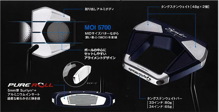 フェースには適切な順回転を生み出すテーラーメイド独自のフェース厚 5 ㎜の Surlynと、アルミニウムの混合インサート「PURE ROLL(ピュアロール)」を採用することで適度な柔らかさと弾き感を兼ね備えた繊細なインパクトを可能にします。
