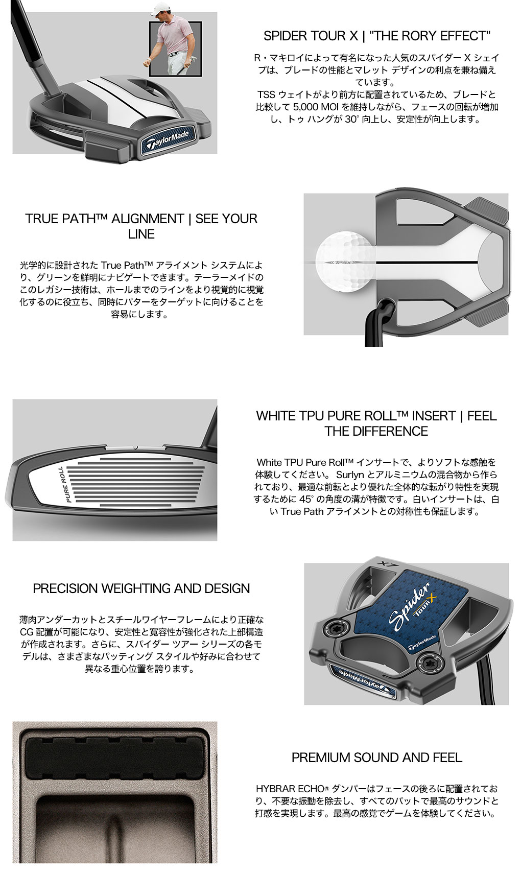 R・マキロイによって有名になった人気のスパイダー X シェイプは、ブレードの性能とマレット デザインの利点を兼ね備えています。 TSS ウェイトがより前方に配置されているため、ブレードと比較して 5,000 MOI を維持しながら、フェースの回転が増加し、トゥ ハングが 30° 向上し、安定性が向上します。