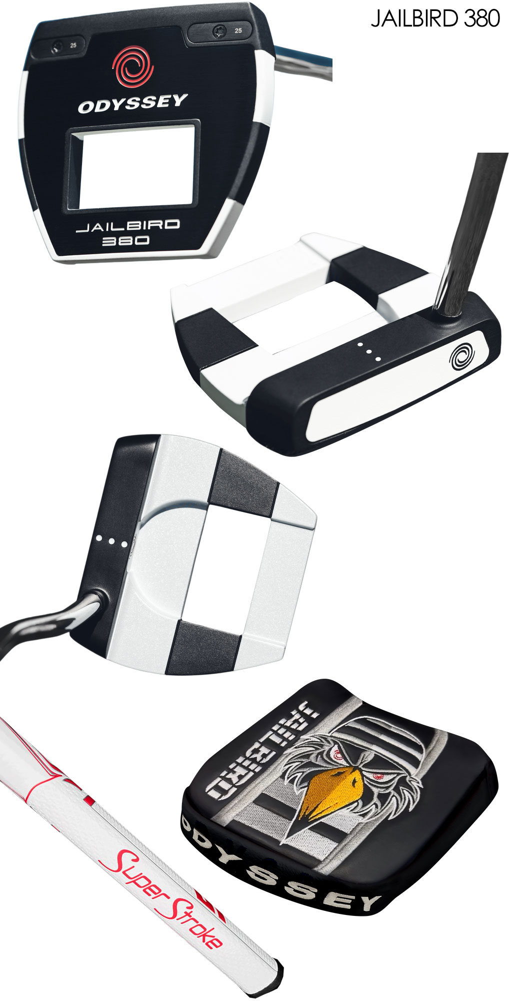 「LIMITED EDITION JAILBIRD 380パター」の名前にある380は、約380gというヘッド重量を表しています。パター長さは39インチ、ライ角は70度、グリップはSuperStroke製のZenergy Tour 3.0 17インチ(ホワイト/レッド)となっており、これらはVERSA JAILBIRDのヘッド形状、VERSAアライメント、マイクロヒンジ・インサートとともに、2023年メジャー第3戦優勝者の愛用モデルとまったく同じ仕様です。また、このモデル専用のヘッドカバーにも注目です。JAILBIRDとは英語で囚人を意味しており、ヘッドカバーには白×黒の囚人服を着た鳥が、鉄格子の間から顔を覗かせているイラストが描かれています。