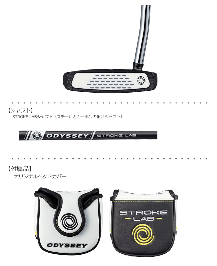 2つのニューヘッドに装着されるのは、もちろん、カーボンとスチールの複合シャフト、「STROKE LAB シャフト」です。STROKE LAB パターにおいてすでに、その評価は確立されており、ツアープロもこぞって使用していることで話題のシャフトとなっています。重量は???オデッセイの通常のスチールシャフトより約40g軽い75gで、余剰重量をヘッドとグリップの手元側に配分することが可能となっています。