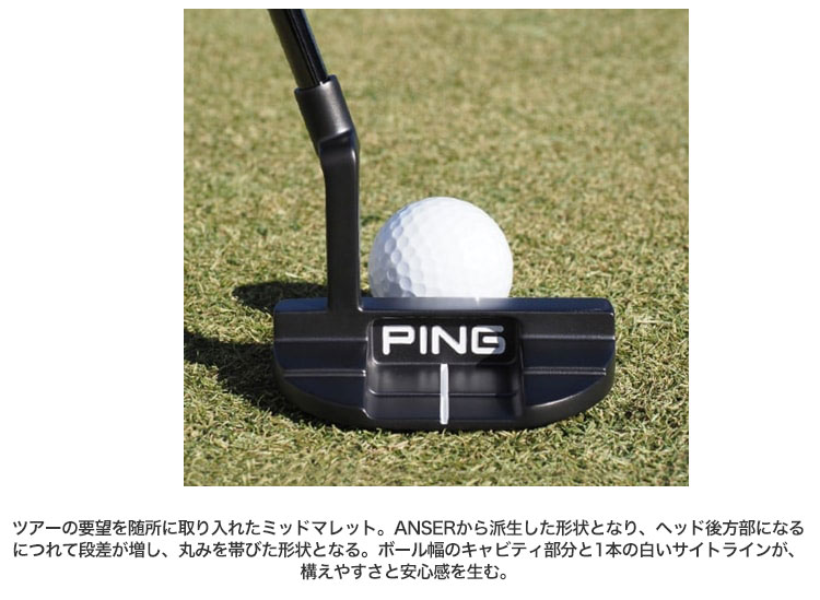 ブレードとマレットの中間サイズのヘッド形状で、操作性に優れたミッドマレット。ボール幅の窪みと1本の白いサイトラインが、構えた時に安心感を与える。