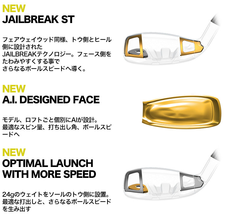 フェアウェイウッド同様に、ROGUE STユーティリティシリーズにおいても、新たにJAILBREAK STが搭載されました。ユーティリティでは、フェアウェイウッドとのヘッド形状、フェースの高さの違いを考慮して、三日月型ではなく、フレーム状の形状を採用。2つがそれぞれヘッド内のトウ・ヒール部に配置されています。これにより、フェースにエネルギーを集中させる効果は維持しつつ、フェースカップの端までしっかりとたわませることが可能となり、ボール初速が最大化。また、2つの JAILBREAK STによって、トウ・ヒールの慣性モーメントも高まっており、ヘッドの動きの安定性やミスヒットへの強さも向上しています。
