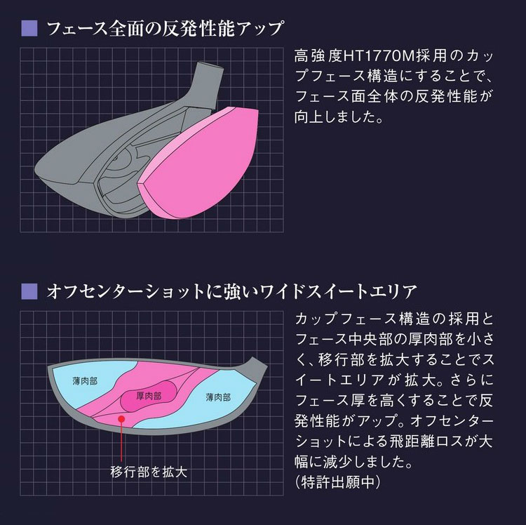 従来のフェース開口構造からカップフェース構造に進化したことでフェース全体の反発性能向上を実現。また、フェース中央部の厚肉部と薄肉部との中間部分にあたる移行部を拡大することでスイートエリアが前モデル比で10%拡大し、オフセンターショット時の飛距離ロスを大幅に減少しました。