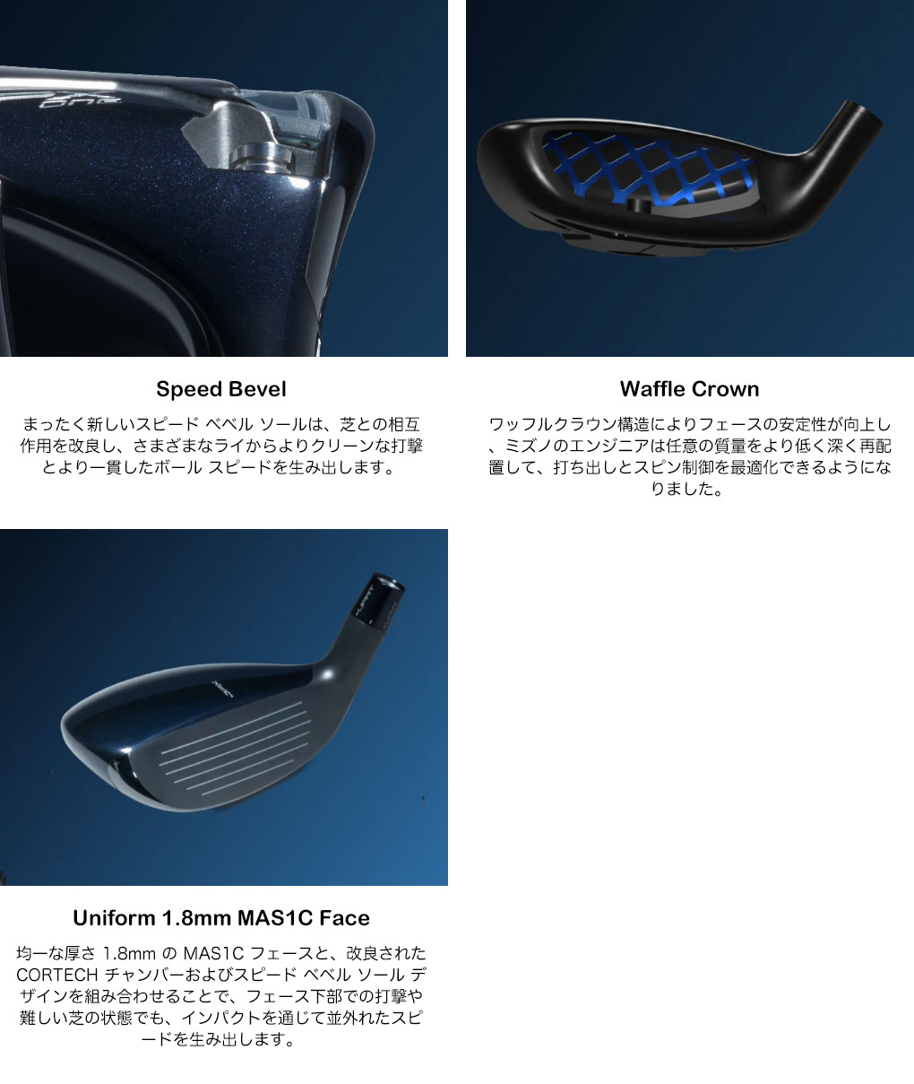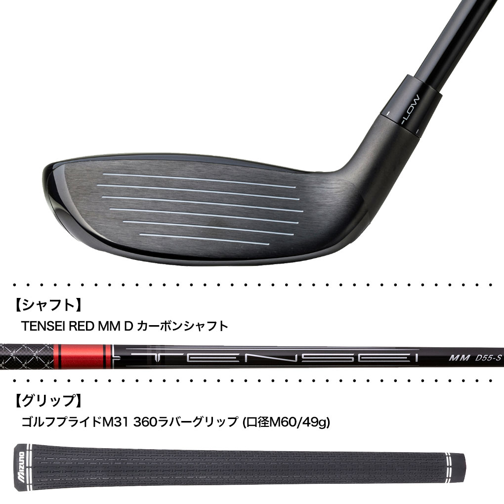 ロフト角は19°、22°、25°、28°から選択可能。ロングアイアンからフェアウェイウッドへのスムーズな移行を実現し、ミズノプレーヤーが求める確かな視覚的安定性と打感を実現します。