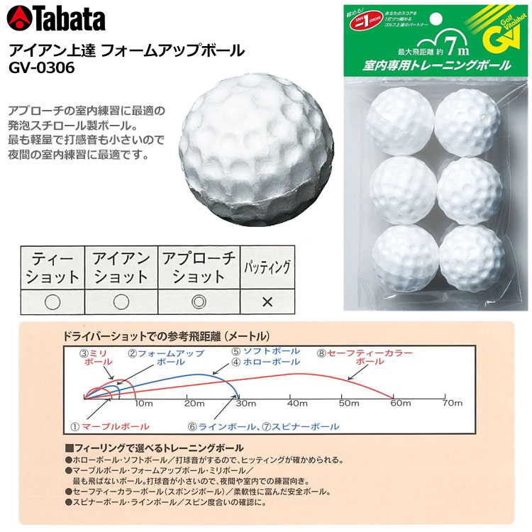 最大飛距離約7m、アプローチの室内練習に最適の発泡スチロール製ボールです。