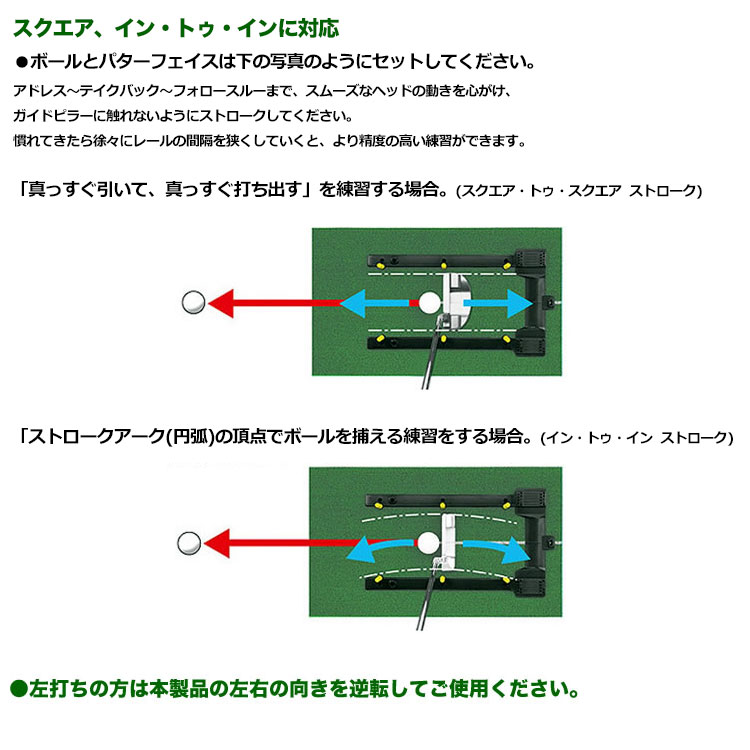 6本の黄色いガイドに触れないようにパッティング。まっすぐ引いてまっすぐ打ち出す軌道をナビゲートしてくれます。