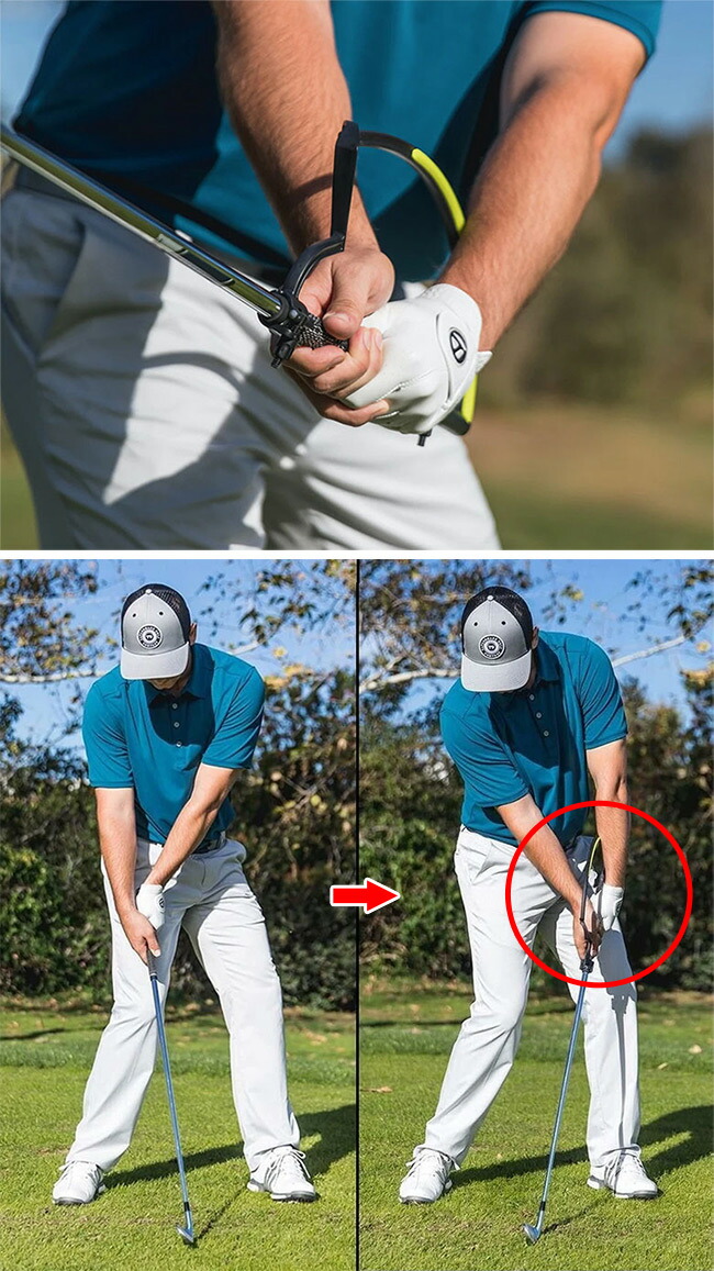 スイング中にクラブフェースが必要以上に開閉したり手首をこねる動きがあると器具が腕から離れてしまうため、即座に修正点が分かります。