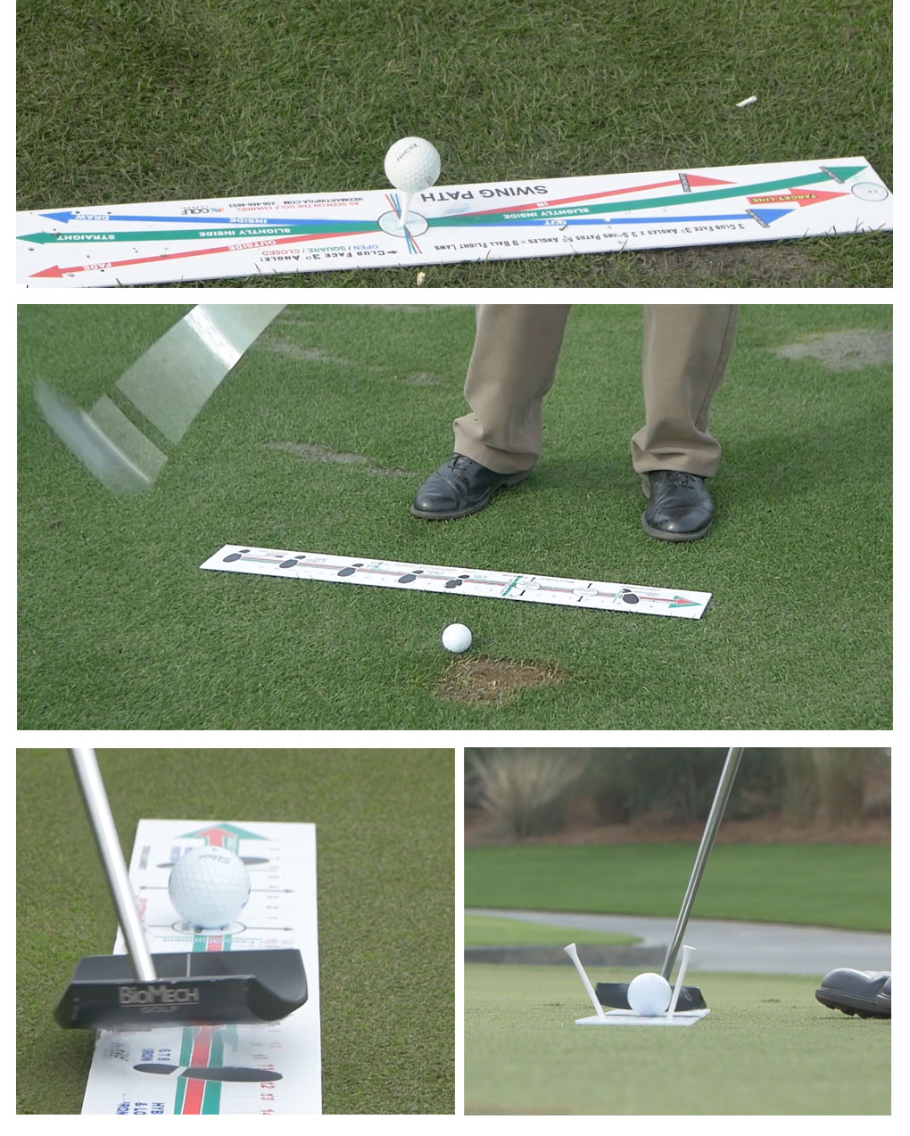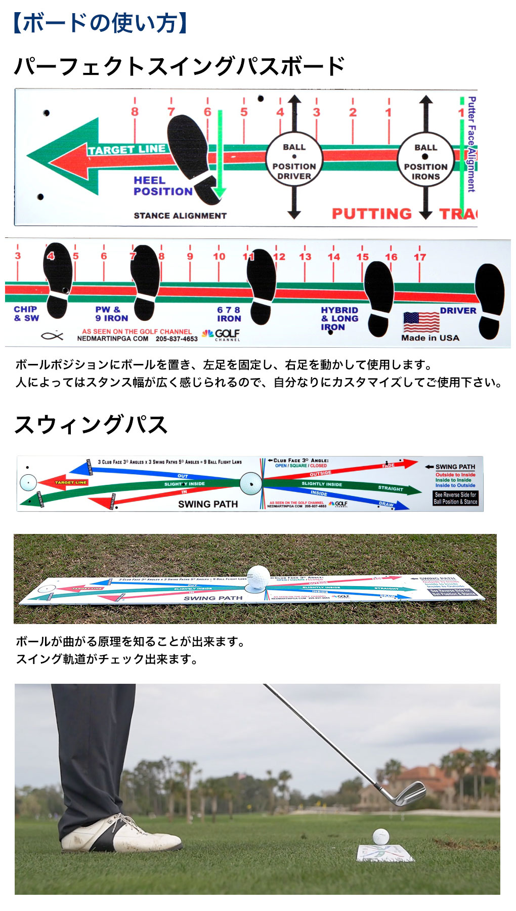 ボールポジションだけでなく、打ちたい球筋別のフェースセットアップ方法やスイング軌道もチェックできるボードです。