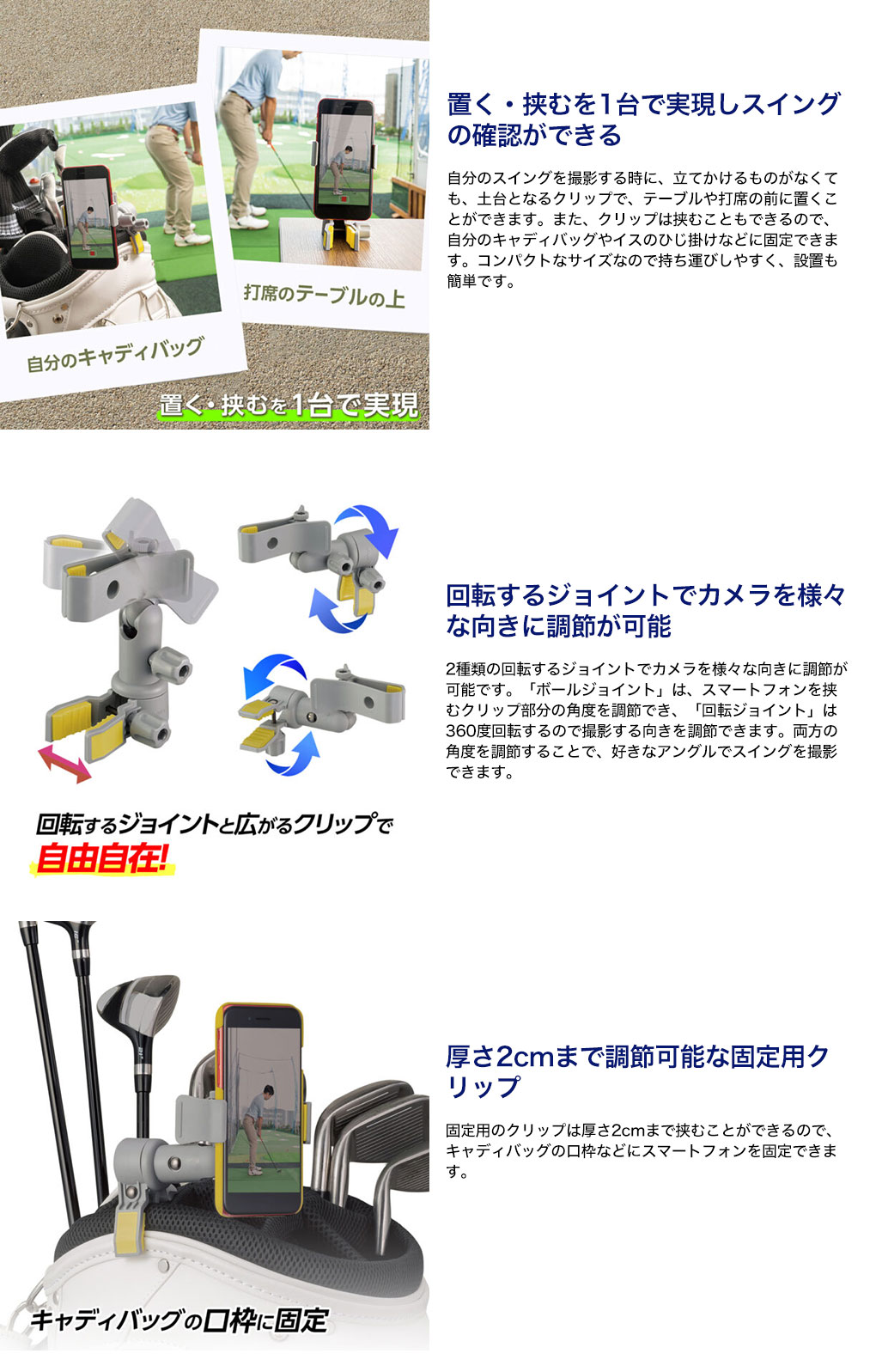 また、撮影時に高さが欲しい時は、固定用クリップでキャディバッグの口枠を挟むことで、正面に近いアングルで撮影できます。