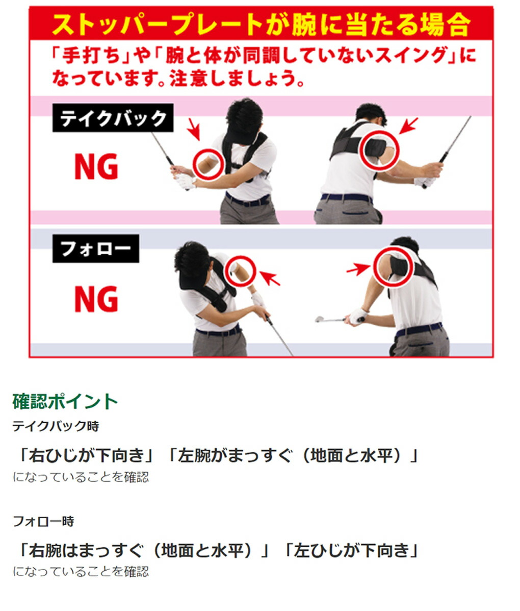 理想的でないスイングをすると本製品の「ストッパープレート」が腕に当たり正しいスイングに導いてくれます。