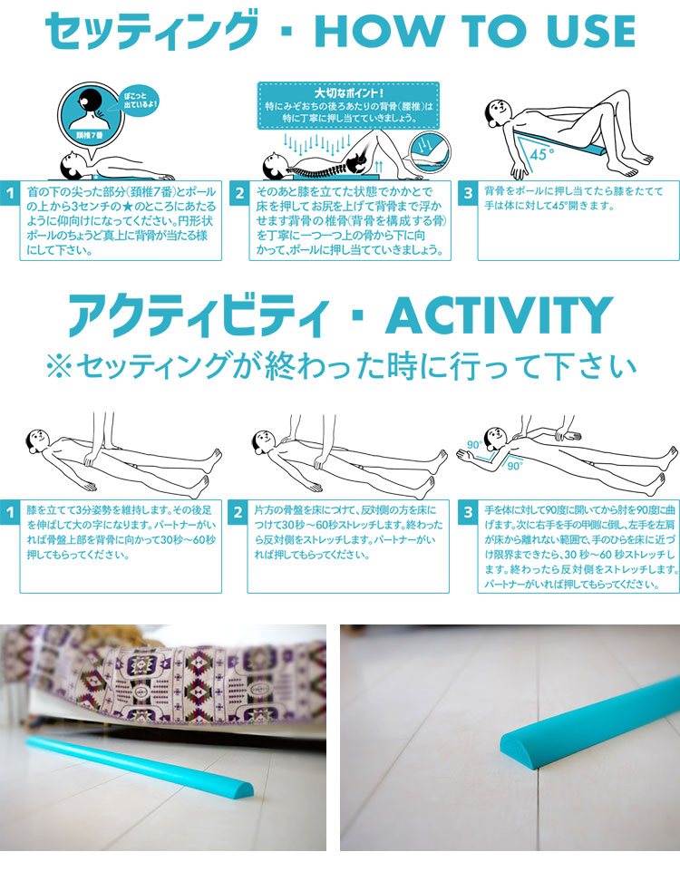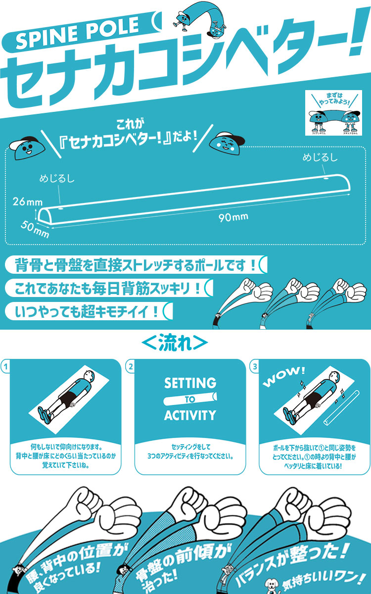<セナカコシベター!>は、どなたでも簡単にメンテナスができるように、その上に寝転んで5分程度の時間で終わる簡単なストレッチを行うことで、背骨と骨盤の位置をニュートラルポジションに戻す手助けをします。
